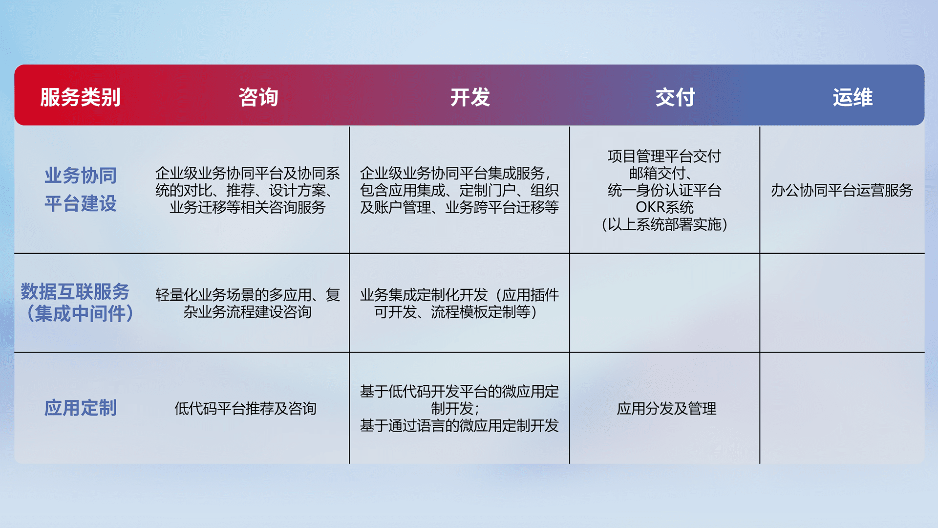 针对钉钉、、、、企微、、、IDaas等平台级产品提供产品的规划、、、、方案、、交付、、、、定制化开发等服务,,实现如统一协同办公、、智能客户服务、、混合会议管理、、、、智能数据查询、、、、等业务场景,,,实现数字化转型。。